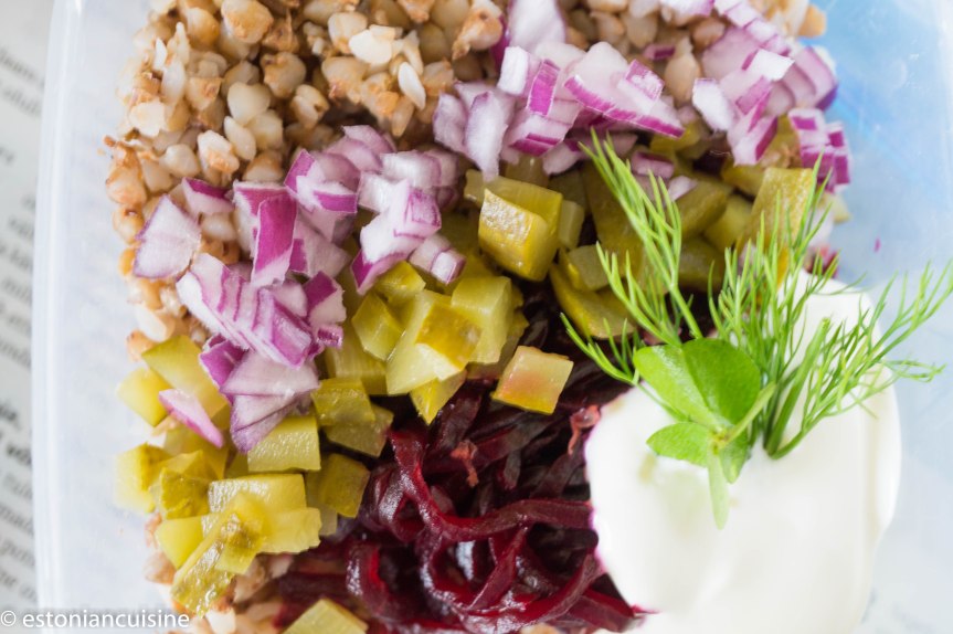 You can serve this with oil- acid sauce, but I like more mayonnaise- sour cream (smetana/creme fraiche) sauce. It makes salad more creamy and nutritious