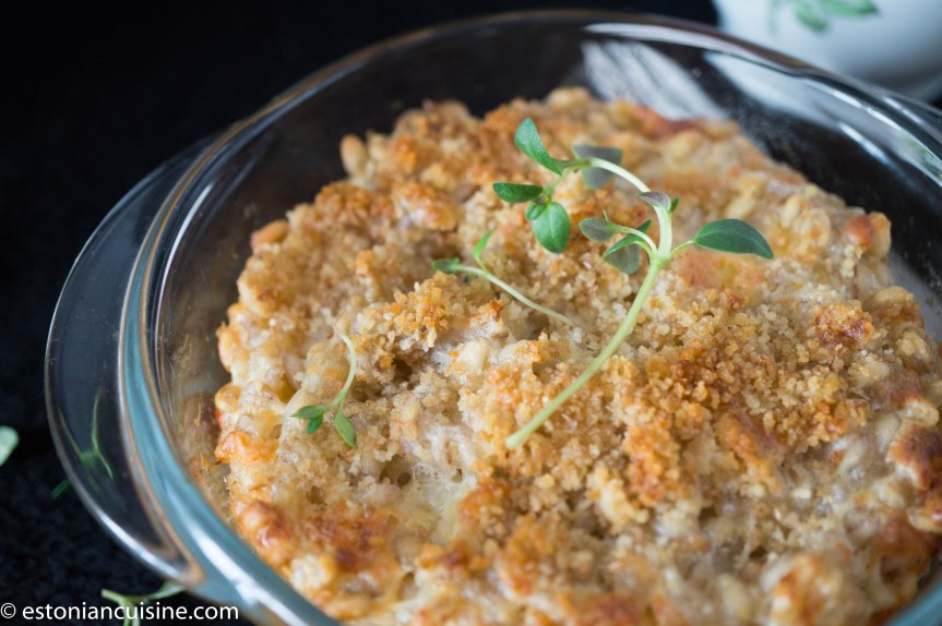 Stir the groats into the sauce and bake in a greased dish ( ca 20 cm ) (sprinkle with bread crumbs)20-25 minutes until browned and bubbly.